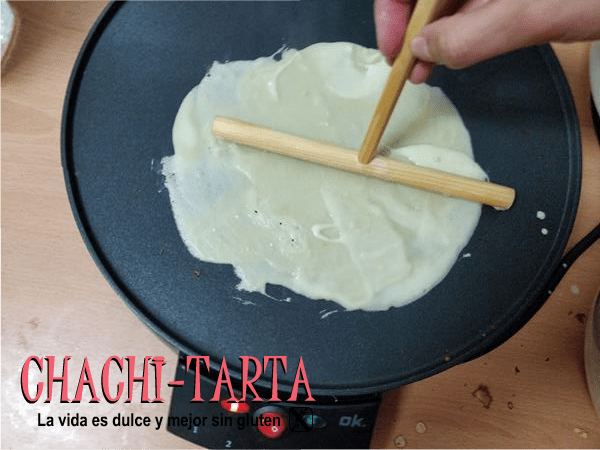 Calienta la sartén con un poquitín de aceite para evitar que se nos pegue la masa; en mi caso he usado mi crepera 🙂 que la tenía un poco abandonada desde hace tiempos en el armario, aunque no es indispensable debo decir que es bastante cómoda.