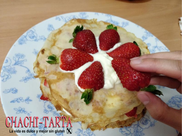 Cuando ya estén fríos los frixuelos coloca uno bien extendido en el plato donde vas a presentar la tarta, con ayuda de una manga pastelera procede a dosificar la nata montada por toda la superficie, luego coloca una capa de fresas cortadas finas, coloca otro frixuelo por encima y repite la operación hasta terminar.