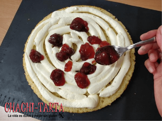 Prepara el molde de horneado y vierte la mezcla, hornea durante una media hora a 170 grados, horno precalentado. Una vez hecho retira del horno y deja que se enfríe para desmoldar. Para rellenarlo, he recortado la parte central que suele siempre abultarse un poquito, y he colocado nata montada con azúcar y un poco de confitura de fresas que le da un toque fresquito a la tarta, viene muy bien la verdad.