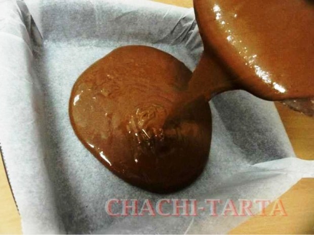 Funde la mantequilla o margarina durante unos 30 segundos al microondas, mezcla con los huevos, el azúcar y la leche hasta que se forme una crema lisa y homogénea; añade la mezcla tamizada de la harina sin gluten, cacao y levadura, bate bien hasta que se deshagan los grumos y vuelca la masa en un molde rectangular ya se de aluminio previamente engrasado o silicona.