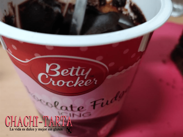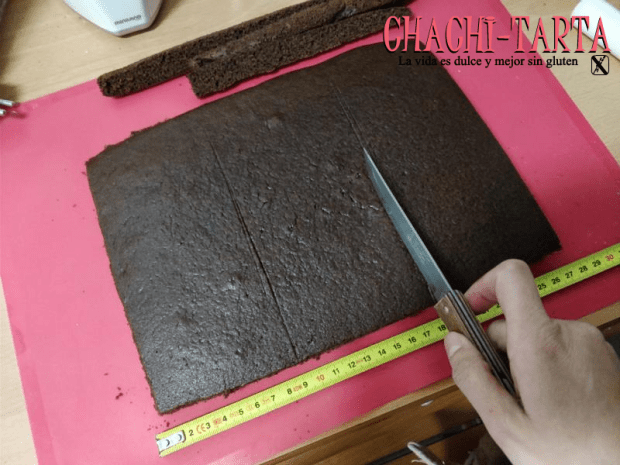 Enfriado el bizcocho, recorta los bordes e iguala la altura del mismo, recorta en 3 partes iguales y forma cuadrados de la misma medida; procede a colocar el relleno y apilalos uno sobre otro. Para el relleno yo he usado crema de chocolate Betty Crocker, a mi me encanta y no es excesivamente dulce, además de ser sin gluten.
