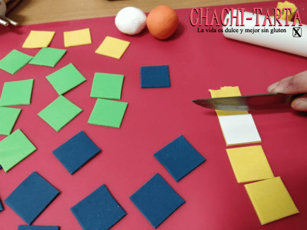 Estira el fondant y recorta 9 piezas cuadradas en función a las medidas de la tarta, mi recomendación es que midas bien y hagas un cuadro de cartulina como patrón, a modo de facilitarte la tarea de recortar las piezas. Deja secar durante unas cuantas horas para que se endurezcan un poco e intenta que las piezas no sean tan finas sino más bien gorditas para que no se deformen al pegarlas.