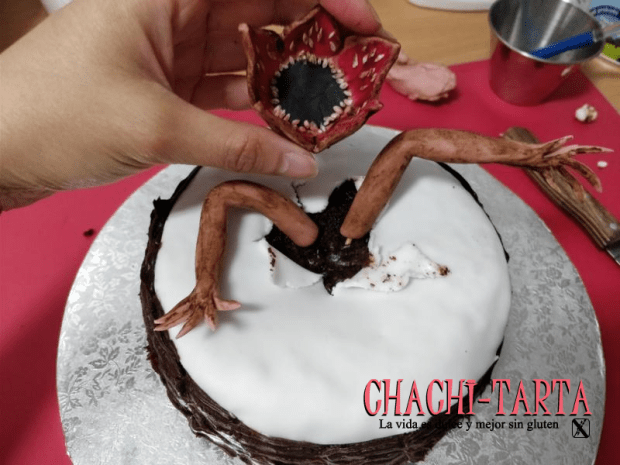 Coloca las piezas del Demogorgon, primero los brazos y luego la cabeza justo dentro del agujero de fondant; la idea es que parezca como si sale de dentro de la tarta (uuuuh que miedo ^^’) y finalmente simularemos las míticas bombillas de la primera temporada de la serie con trocitos de fondant bajo los cuales escribiremos el nombre del cumpleañero.