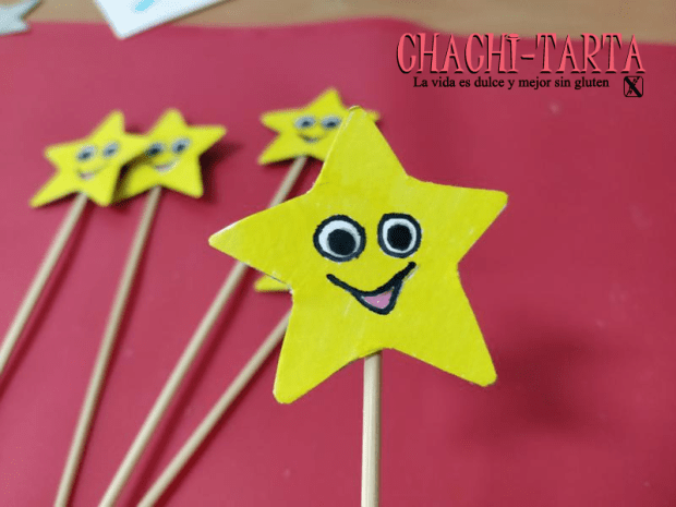 Colocaremos el conejo sobre un circulo de fondant color verde (así es el conejo original), y lo pondremos en el centro de la tarta, para rematar la decoración, ya que el juguete canta constantemente la canción «brilla brilla estrellita», he hecho unas estrellas de cartulina en color amarillo, que he puesto pegadas en palillos de madera para brochetas y he incrustado por detrás del conejín, le da un toque muy alegre y hace alusión a su canción pegadiza jejeje