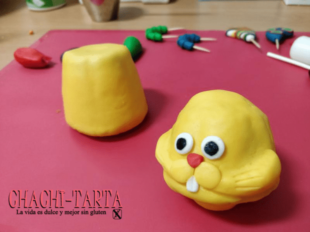 Extiende el fondant amarillo y cubre las magdalenas por completo, a la de mayor tamaño le insertaremos un palillo (de los de piruleta) por el centro, para poder incrustar la cabeza y que quede firme. Pegaremos las piezas como tiene que ser e insertaremos las orejas y los brazos que previamente hemos dejado secar.