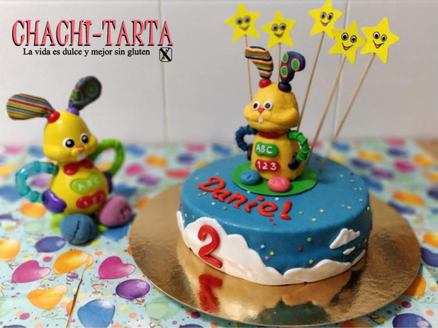 Así ha sido, y yo por supuesto me encargué de organizarlo todo y de hornear la tan ansiada CHACHI-TARTA, que todos querían ver. La temática de este año fue su juguete favorito, el conejo cantarín que tanto le encanta; todos tenemos un juguete favorito de pequeños y este conejín es el favorito de mi Dani, es como su mejor amigo, lo lleva a todas partes y hasta ha aprendido a tararear la musiquilla que emite al son de «Brilla brilla estrellita» jejeje es tan simpático que le hemos cogido cariño, así que no se me ocurrió otra idea mejor para su tarta de cumpleaños.