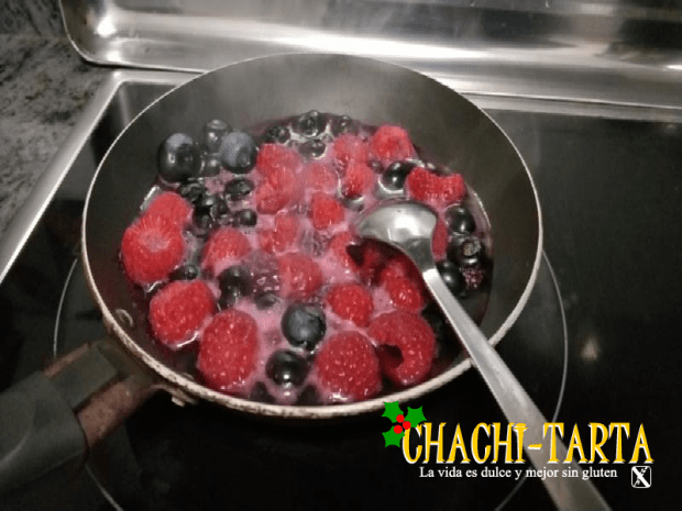 Empieza por preparar el coulis de frutos rojos, para ello en una sartén a fuego medio calienta los frutos junto con un poquito de agua y una cucharada de azúcar blanca, cuando ya estén blanditos y hayan soltado todo su jugo aplasta con la cuchara, añade media hoja de gelatina neutra previamente hidratada, remueve hasta que se disuelva y retira del fuego hasta templar.