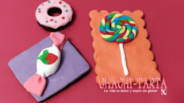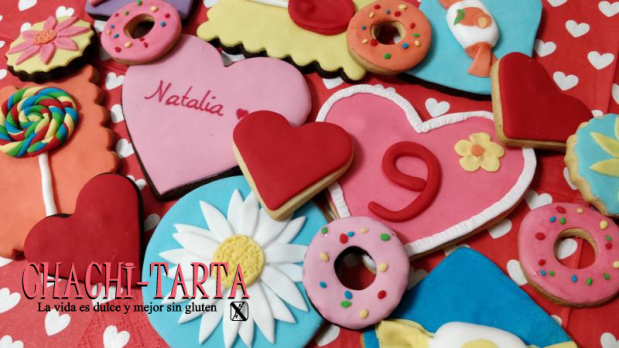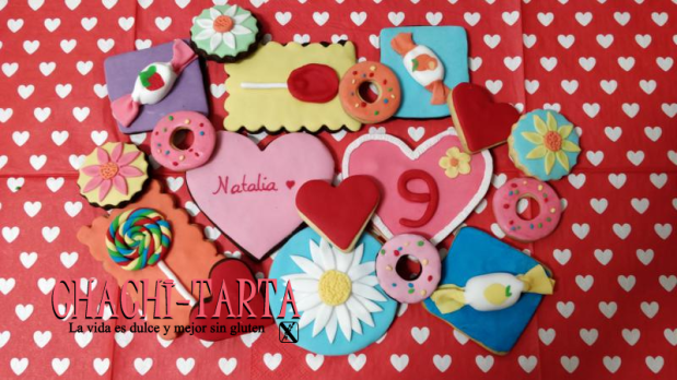 Desde que Natalia era muy pequeñita, su mami me encarga cositas para el cumple, al principio eran tartas con princesas Disney y ahora que es un poco mayor desde hace unos años galletas con alguna afición suya o temática que le guste. Este año ha sido enfocada a las chuches, que nunca pasan de moda tanto en niños y adultos, corazones y flores también han tenido lugar en este colorido encargo tan divertido y libre de gluten.