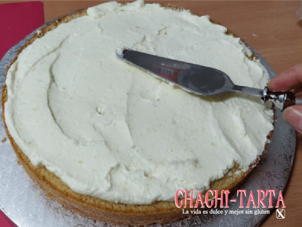 Recubre la superficie del bizcocho con un poco del relleno para que se ponga pingosillo y el fondant se adhiera mejor, pero no te pases porque el exceso de humedad no le viene bien a este tipo de coberturas. Una vez preparado resérvalo en la nevera hasta el momento de decorar.