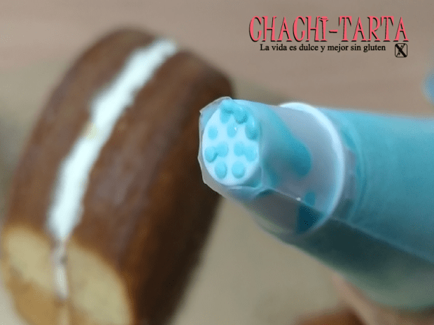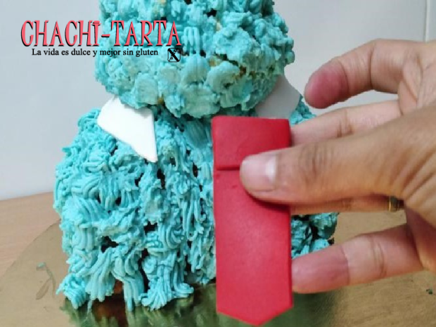 Procede a cubrir toda la superficie del bizcocho lo más abundante que puedas, presiona un poco la boquilla al bizcocho con cada movimiento para que quede adherida al mismo, al principio parece que cuesta pero luego coges el tranquillo 😉 … una vez cubierta la parte superior, coloca la pieza de bizcocho que corresponde a la cabeza y procede a cubrirla también de la crema azul. Ojo, no untes demasiado sobre la cabeza, pues el sombrero al ser de fondant y estar en contacto con demasiada crema puede perder estabilidad.