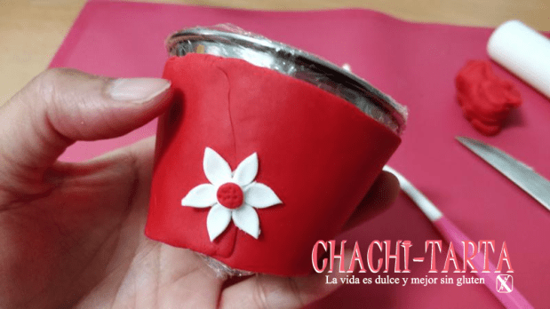 Finalmente, una vez seco y firme, extraje la flanera y lo rellené con papel film para que cogiera un poco de estabilidad, posteriormente cubrí el agujero de la parte de arriba con otra pieza de fondant rojo. Todo este procedimiento lo tienes explicado en el videotutorial al final de esta publicación.