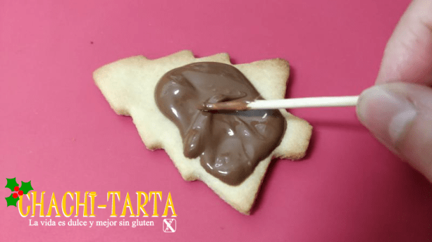 Con una cucharilla vuelca un poco de chocolate encima de la galleta, con ayuda de un palillo de madera extiende el chocolate de la manera más uniforme posible por toda la superficie.