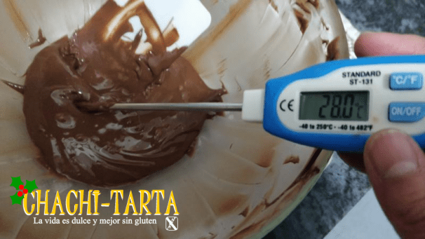 Este proceso puede demorar un poco ya que el chocolate conserva mucho tiempo su temperatura, así que tendrás que armarte un poco de paciencia y remover tantas veces como sea necesario comprobando cada poco con el termómetro hasta llegar a la temperatura de enfriado indicada.