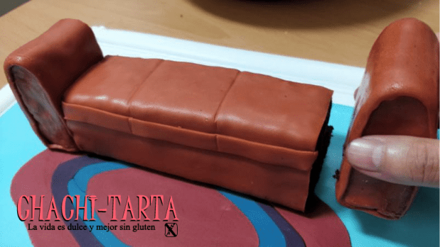 Forra cada pieza por separado, los brazos, el asiento y el respaldo; si notas que la cobertura empieza a ponerse pingosa mete las piezas y la cobertura unos minutos en la nevera (pero solo unos minutos) e intenta mantener tus manos frescas y secas. Puedes espolvorear un poco de maizena sobre la superficie, sobre el rodillo y sobre tus manos (pero muy poco), esto es para evitar que se te quede pegado cuando lo extiendas. Esta vez no quise colocar relleno entre los bizcochos pues ya con la cobertura tiene bastante.