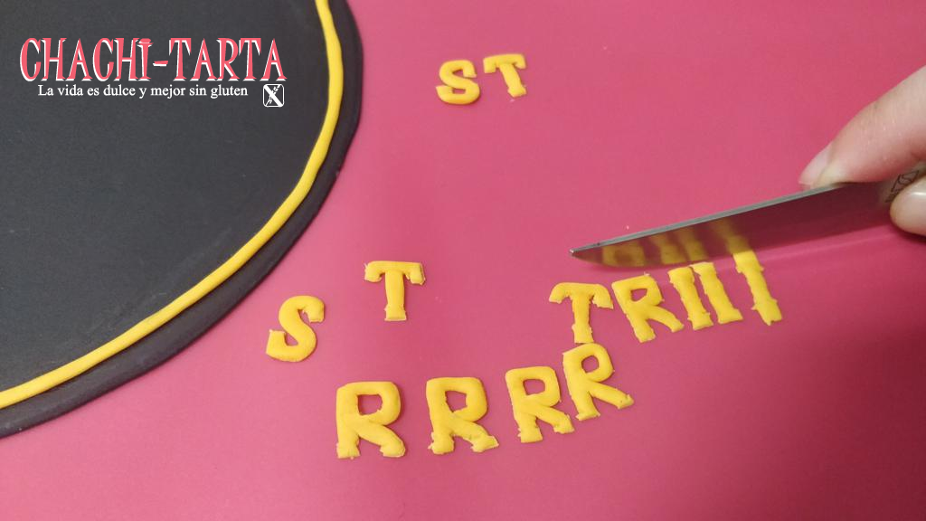 Antes de montar la tarta y toda su decoración, es necesario que dejes enfriándola muchas horas, yo suelo hornear un día antes y la dejo reposar toda la noche, mientras tanto me da tiempo a ir preparando los detalles, en este caso el clásico logo de Cobra Kai, hecho a base de pasta fondant de azúcar.