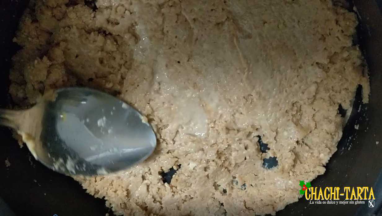 Para compactar la base de galletas necesitamos humedecerlas, lo normal es añadir mantequilla fundida pero la verdad a mi no me gusta mucho pues pienso que ya bastante grasita tienen las galletas como para echarles más 😛 pero bueno, es cuestión de gustos y de costumbre la verdad. Lo que yo hago es simplemente humedecer con un poco de agua o leche, tanto como se necesite para que quede una pastita no demasiado aguada y se pueda repartir y amoldar fácilmente en toda la base del molde. Para hacer esto puedes utilizar ya sea tus propios dedos o una cuchara mojada. Una vez la tengas lista conserva en la nevera.