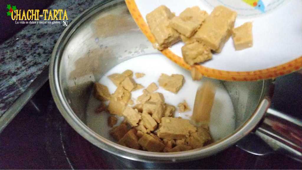 Cuando la leche empiece a humear (no hace falta que este hirviendo), añadiremos el turrón en trocitos y removeremos hasta que se disuelva por completo. A continuación agregaremos una a una las láminas de gelatina hidratadas y escurridas, y removeremos hasta que todo quede completamente integrado. Retiramos del fuego y reservamos.