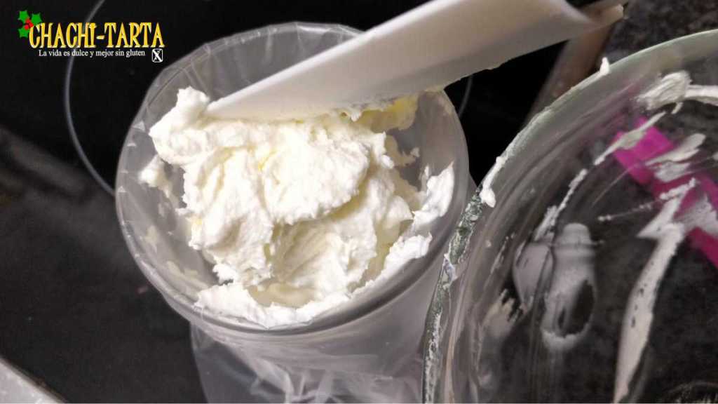 La mitad restante de la nata la utilizaremos para decorar, por tanto vamos a montarla a punto de nieve, mi recomendación es que utilices un poquitín de Natafix o cremor tártaro, para hacerlo fácil y que además nos quede con más consistencia, con la puntita de una cucharadita será suficiente (1 gr o así). Si tienes batidora eléctrica mejor, pero al utilizar el Natafix lo puedes hacer muy fácil incluso manualmente ayudándote de unas varillas de cocina. Guarda la nata en una manga pastelera con boquilla rizada dentro de la nevera hasta que vayamos a utilizarla.