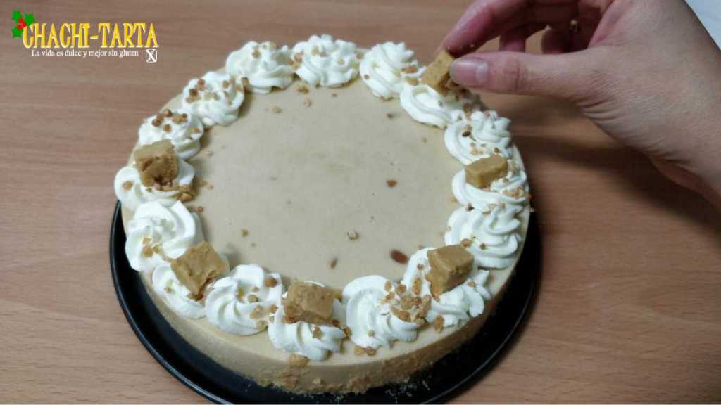 Para terminar lo que nos queda es poner un poco de decoración. Con la manga pastelera haz decoraciones en el borde, o como sea de tu preferencia, espolvorea almendra crocanti (cubitos de almendra tostada, ya la venden así) y para rematar coloca trocitos pequeños de turrón, y listo!