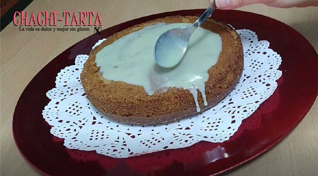 Con una cucharilla reparte el chocolate por toda la superficie, escurriendo por los bordes para decorar; hay que hacerlo rápidamente porque al ser el glaseado de chocolate tiende a endurecer con facilidad.