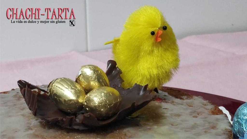 He colocado por encima del nido unos mini-huevitos de chocolate que compre en el supermercado, hay que mirar etiquetas porque estos en particular no ponían etiqueta «sin gluten», pero bueno… y para rematar no podía falta, claro… el pollito!