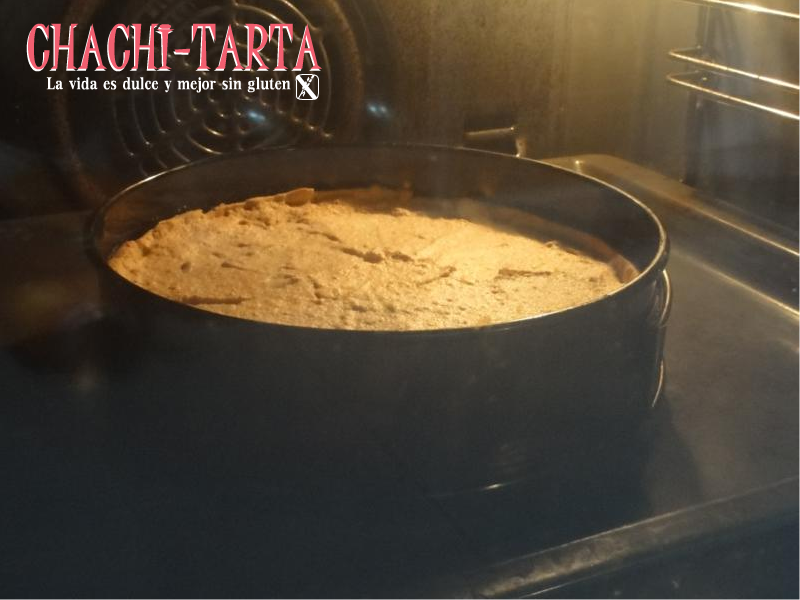 Vuelca la mezcla en el molde de hornear e introdúcelo al horno a 170 grados (habiéndolo calentado previamente unos 15 minutos), espera unos 25 a 30 minutos hasta que veas que está doradito por encima, notarás que está hecho porque huele de maravilla, si te aseguras introduciendo un palillo antes de sacarlo mejor, si el palillo sale seco es que ya está listo. Deja enfriar bien antes de desmontar y por supuesto antes de decorar, normalmente yo suelo hornearlo la noche antes.