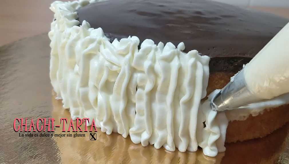 Al cabo de unas 2 horas retira cuidadosamente el papel vegetal, y recubre los bordes del bizcocho con la nata de choco blanco del relleno, asegúrate de repartirla equilibradamente para que luego no tengas sorpresas!