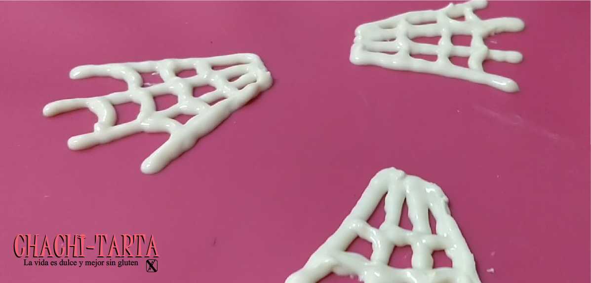 Para complementar la decoración he hecho unas letras con la fuente de Spiderman, y unas telarañas hechas con chocolate blanco para que se vea más vistoso. Para no llevarte sorpresas, como que se te rompan a último momento, te sugiero hacer varias… por si acaso.