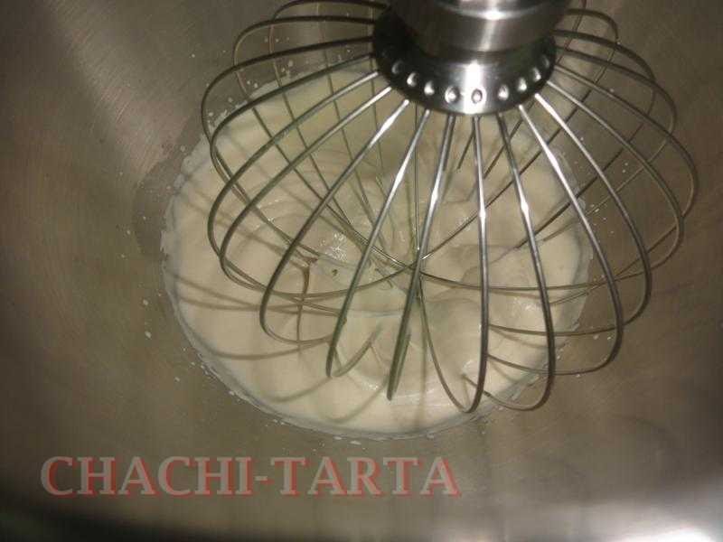 En un bol calienta el chocolate blanco y reserva hasta que se baje un poco la temperatura. Poco a poco, añade la nata para postres a la vez que vas batiendo con ayuda de varillas o batidora eléctrica, hay que hacerlo muy poco a poco para que el chocolate no se solidifique de golpe; si quieres añadir más consistencia puedes agregar crémor tártaro (Natafix) pero yo creo que no hace falta pues el chocolate ya le da bastante consistencia.