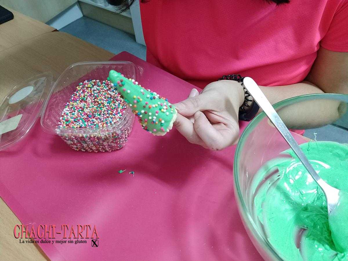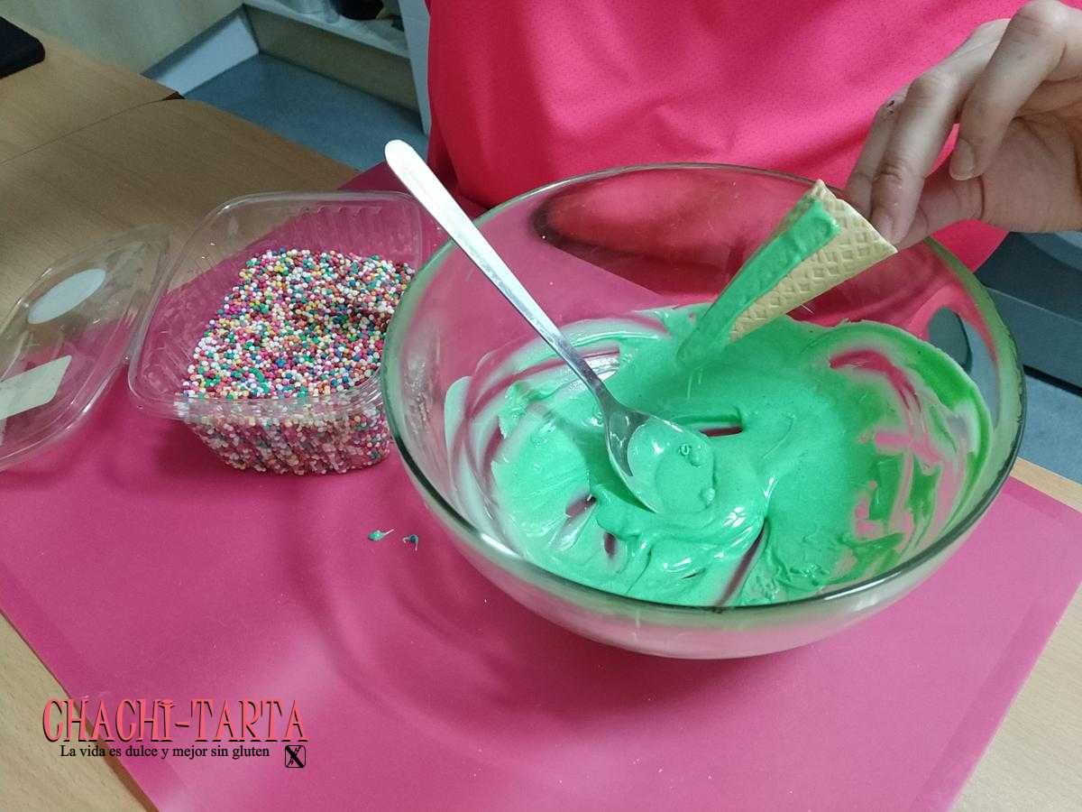 Por otra parte, funde más chocolate blanco (media tableta será suficiente) y añade un poquitín de colorante verde, mejor que el colorante sea en gel y no líquido para no «aguar» el chocolate. Remueve y con ayuda de una cucharilla o espátula unta la superficie del cono, quitando el exceso; rápidamente espolvorea grajeas de colores y reserva hasta que se endurezca el chocolate.