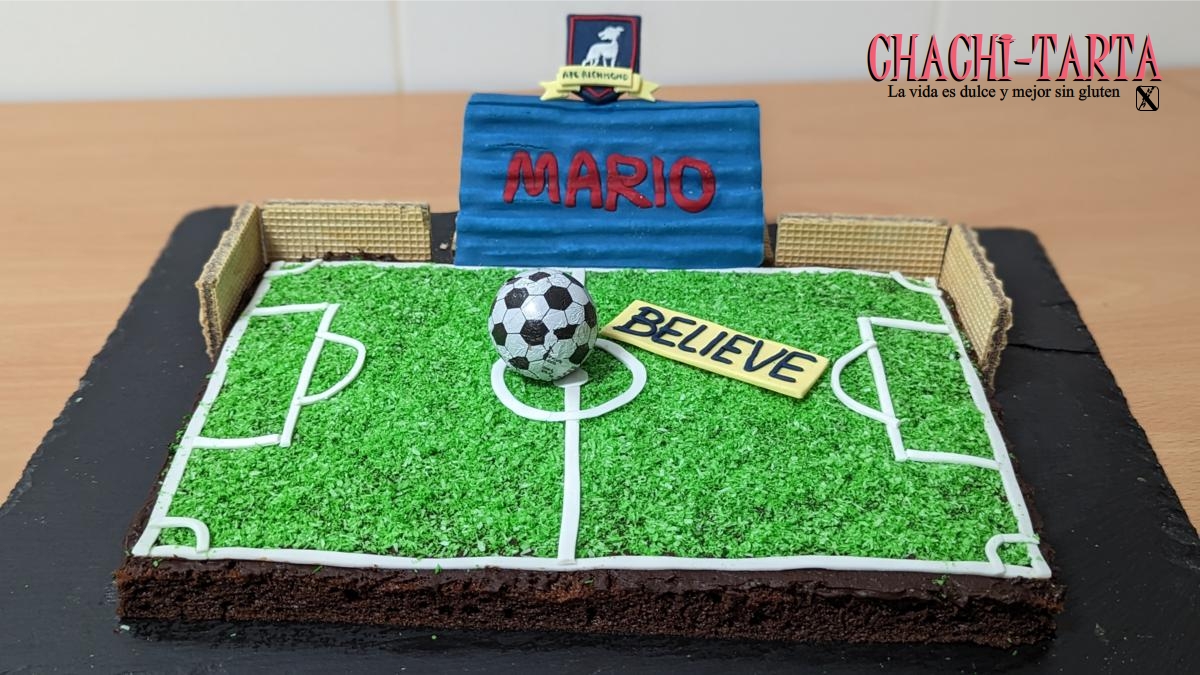 Si eres fan del futbol y también del chocolate, combínalos y obtendrás tu tarta favorita 🙂 en esta ocasión para celebrar el cumpleaños de mi marido, muy fan de la serie «Ted Lasso» que acabó por engancharme también a mi. Como siempre sobra decir que todos sus ingredientes (excepto el balón que no estoy del todo segura si lo es) son sin gluten.