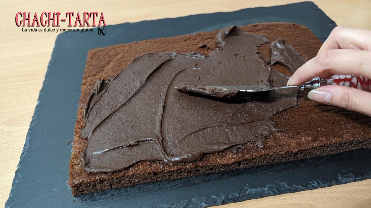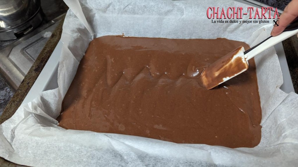 El bizcocho es de chocolate 100% sin gluten, esta vez he utilizado un molde de aluminio de 21×27 cm recubierto de papel vegetal para desmoldar facilmente.