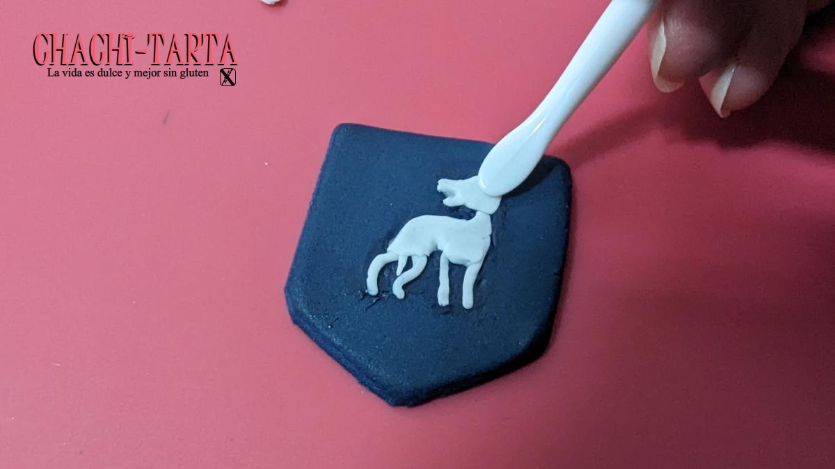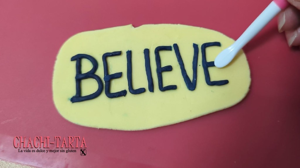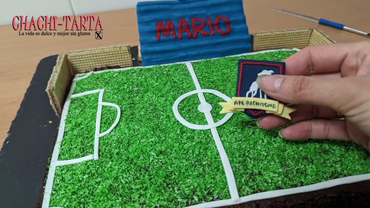 Prepara con anticipación (1 día antes), cualquier decoración hecha en fondant, en este caso he hecho el escudo del Richmond, el rótulo «BELIEVE» y las gradas a base de pasta fondant de azúcar.