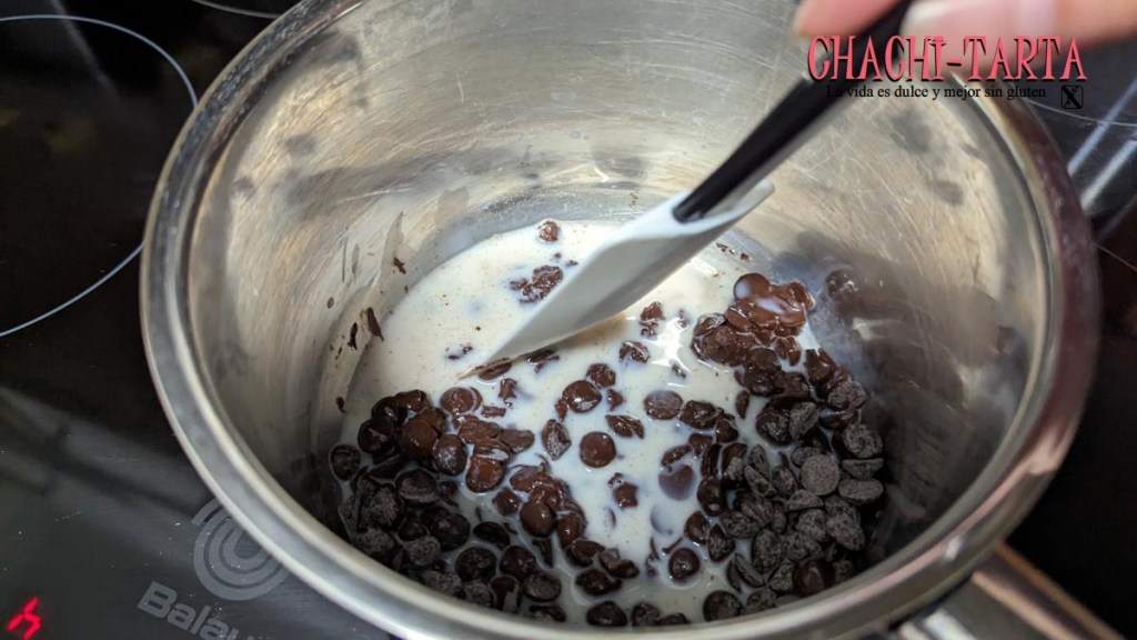 Otra cosa que conviene preparar con antelación, es la ganaché o crema de cobertura para el bizcocho. En esta ocasión no he querido rellenarlo sino simplemente cubrirlo; para ello vamos a calentar unos 50ml de nata para postres ya fundir una tablilla de chocolate negro (150 gr), removiendo constantemente hasta fundir al completo retiramos del fuego y dejamos enfriar.
