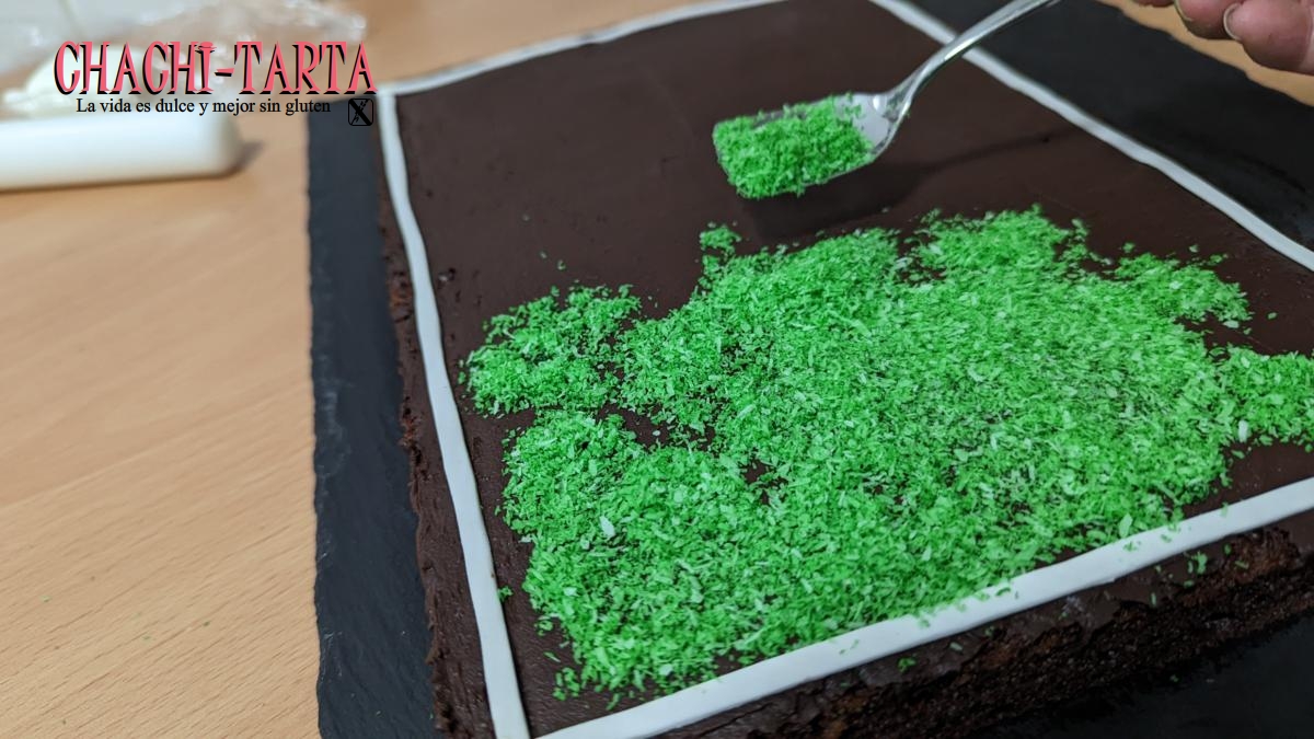 Para simular la hierba he utilizado coco rallado, y colorante alimenticio verde en gel. Para pintarlo, basta con meterlo en una bolsa con cierre y añadir un poco de colorante y mezclar poco a poco añadiendo mas cantidad si hace falta hasta obtener el tono deseado.