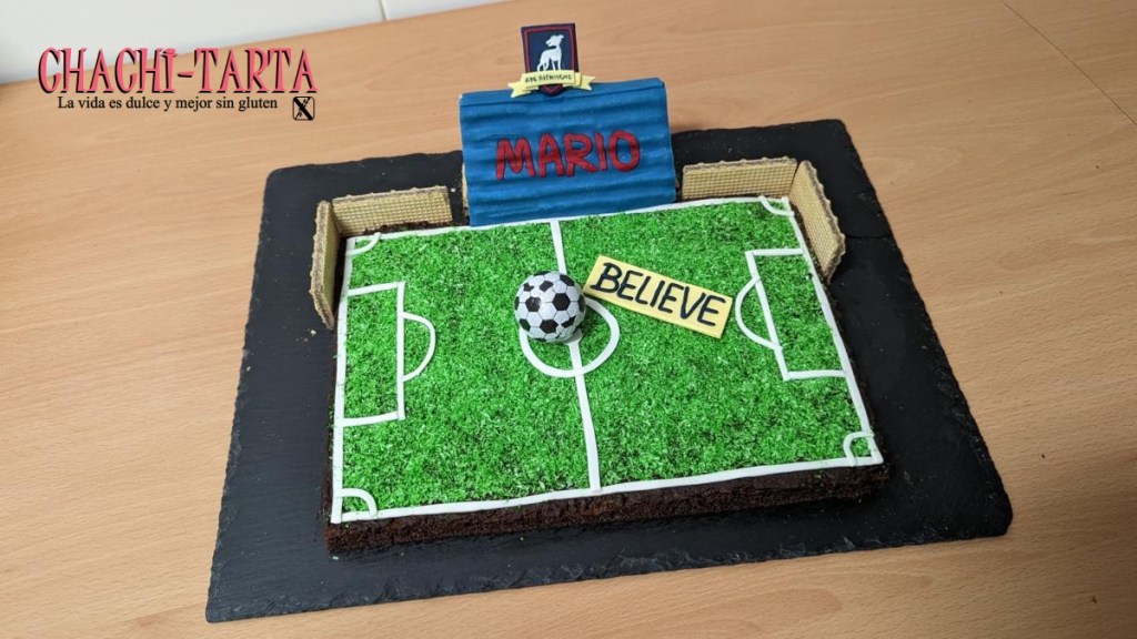 Si eres fan del futbol y también del chocolate, combínalos y obtendrás tu tarta favorita 🙂 en esta ocasión para celebrar el cumpleaños de mi marido, muy fan de la serie «Ted Lasso» que acabó por engancharme también a mi. Como siempre sobra decir que todos sus ingredientes (excepto el balón que no estoy del todo segura si lo es) son sin gluten.