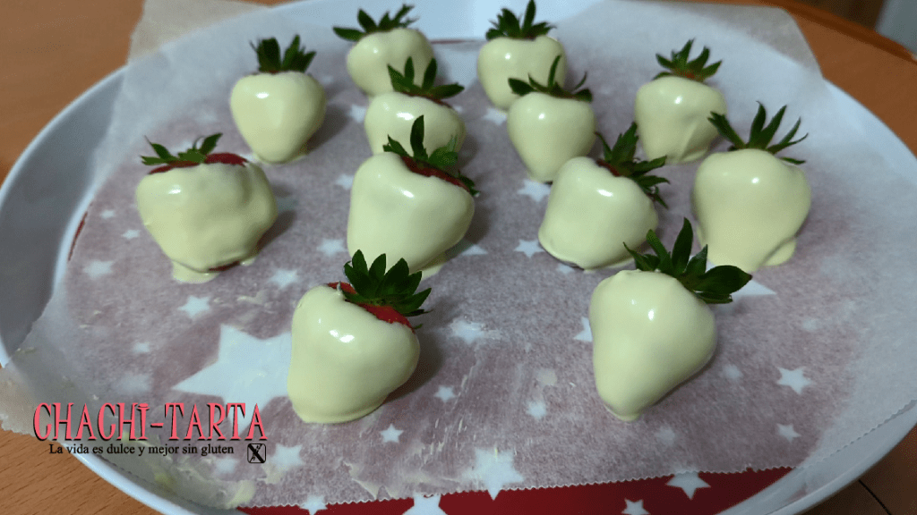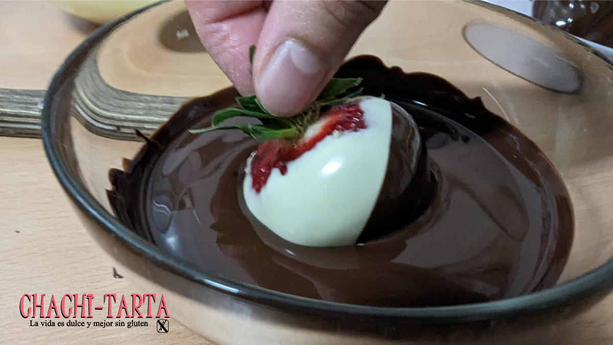 Prepara un plato o bandeja grande colocando una hoja de papel de horno. Una vez fundidos los chocolates, coge cada fresa por la hojas y sumérgela cuidadosamente en el chocolate blanco, escurre lo más posible el exceso de chocolate y coloca en la bandeja hasta que el chocolate se endurezca dejando unos centímetros de separación entre cada una.