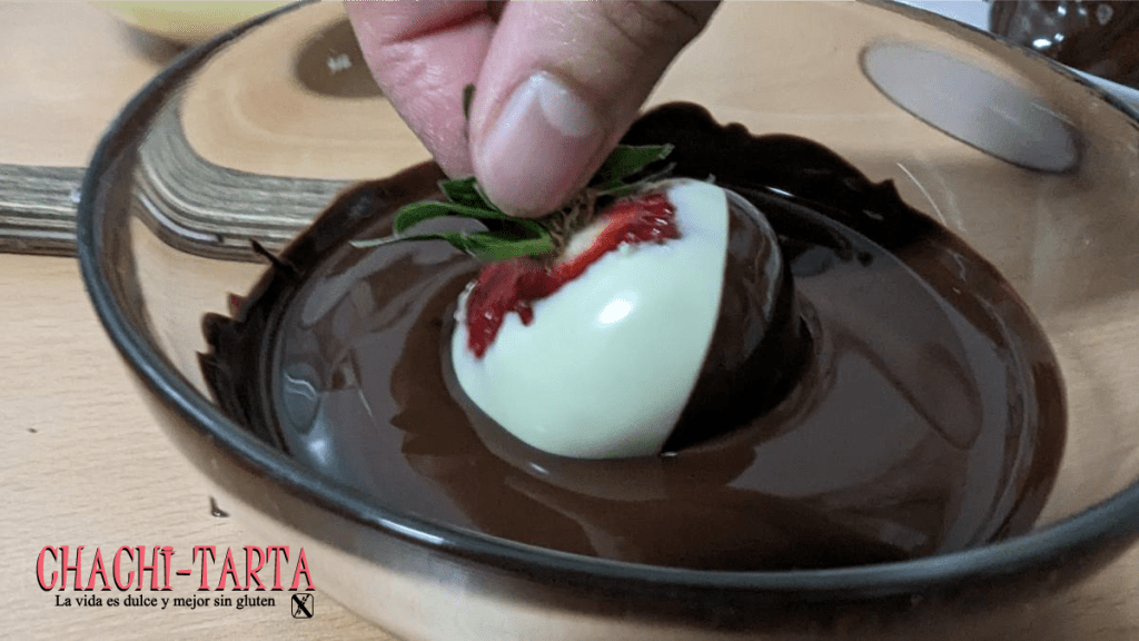 Para el novio, coge la fresa de las hojas y con cuidado sumerge en el chocolate negro de forma ladeada, repite la operación ladeando en el sentido contrario, a modo de formar la chaqueta.