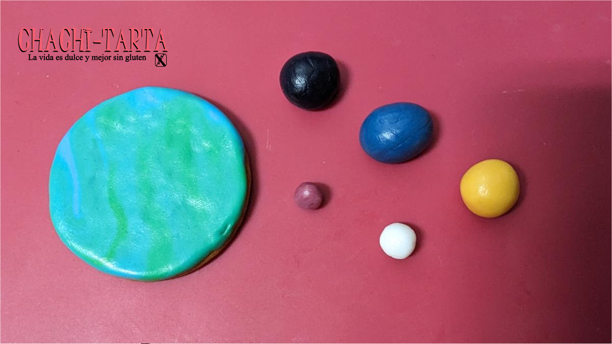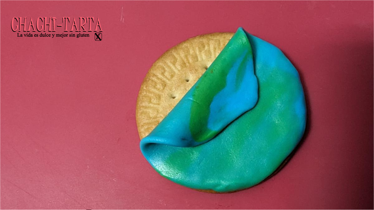 Para la base de las galletas mezclé 2 trocitos de fondant, uno de color azul y otro verde, sin amasar demasiado para que quedasen vetas, estiré con rodillo y recubrí las galletas.