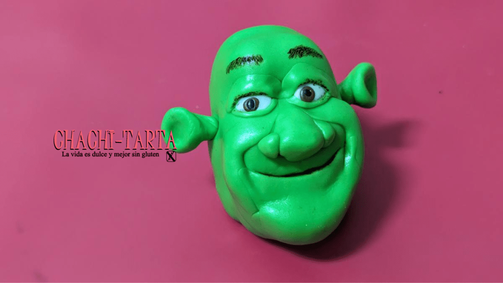 Modelar a Shrek fue toda una odisea, empezando por que no encontraba fondant de azúcar comercial por ninguna parte, no se si es que está pasado de moda o que a los supermercados ya no les tiene cuenta traerlos, yo que sé… el caso es que solo yendo a la tienda de repostería pude conseguir una marca rara que nunca había usado antes.