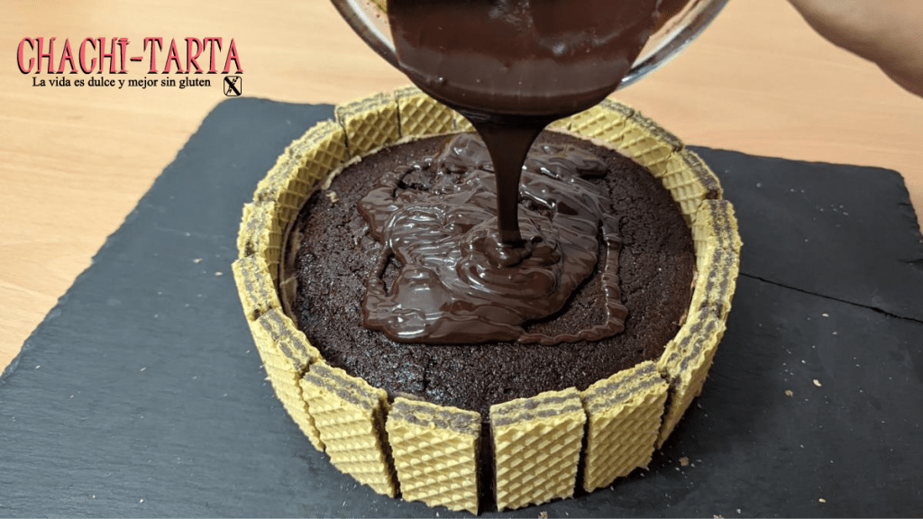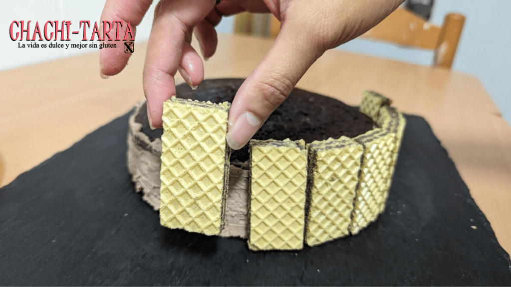 Para añadir otro toque decorativo decidí usar galletas tipo barquillo en todo el borde del bizcocho, que por supuesto son sin gluten.
