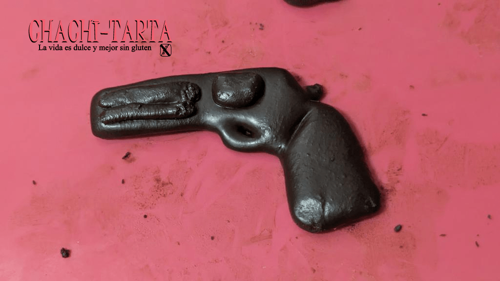 Las pistolas están hechas de chocolate plástico negro, es difícil explicar como las hice, pues lo hice según se me ocurría, de todas formas tienes un video al final de esta publicación en donde se ven un poco mas los detalles, pero bueno, así quedaron…