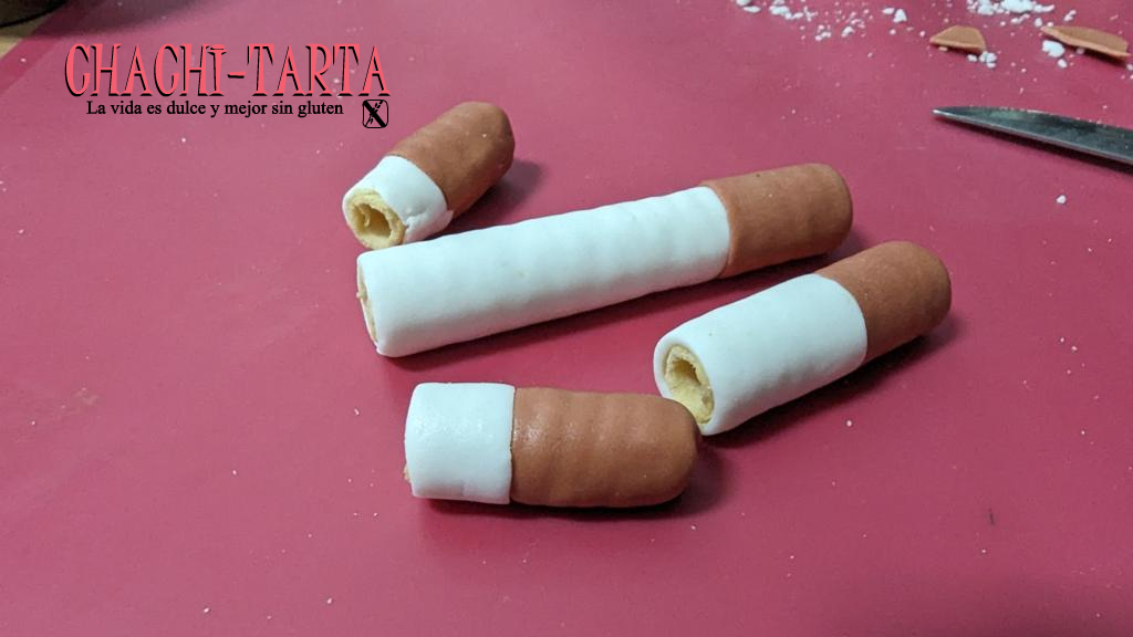 Los cigarros en realidad son tubos de barquillo recubiertos con fondant blanco y marrón, para darle realismo he puesto cacao en polvo a manera de la ceniza, y han quedado estupendos!