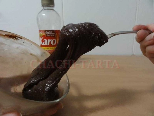 La cantidad de sirope dependerá del tipo de chocolate que usas, pero por lo general no suele ser mucho, apenas unas 2 cucharadas bastarán para unos 100 gr de chocolate. Esto lo metes al microondas y mezclas hasta que haya cogido la consistencia deseada, puedes añadir mas sirope si ves que no está lo suficientemente moldeable.