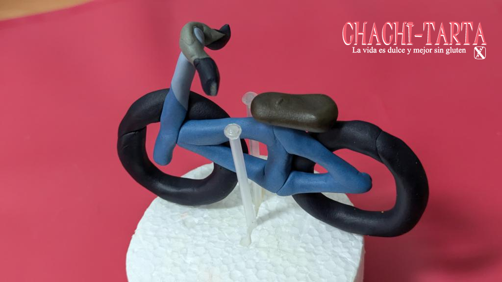 Otra cosa que tuve en cuenta, para hacer que fuese más estable, tanto en las barras principales de la bici como en las piernas de los muñecos fue incrustar trocitos de espagueti, y no porque sean los personajes italianos 😆 esto es porque los palillos de madera no se ven a simple vista y si de pronto alguien (llámese Daniel) va y le pega un mordisco no se lleve una sorpresa.