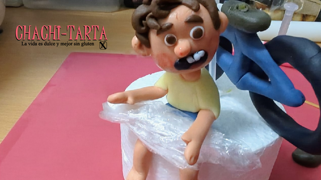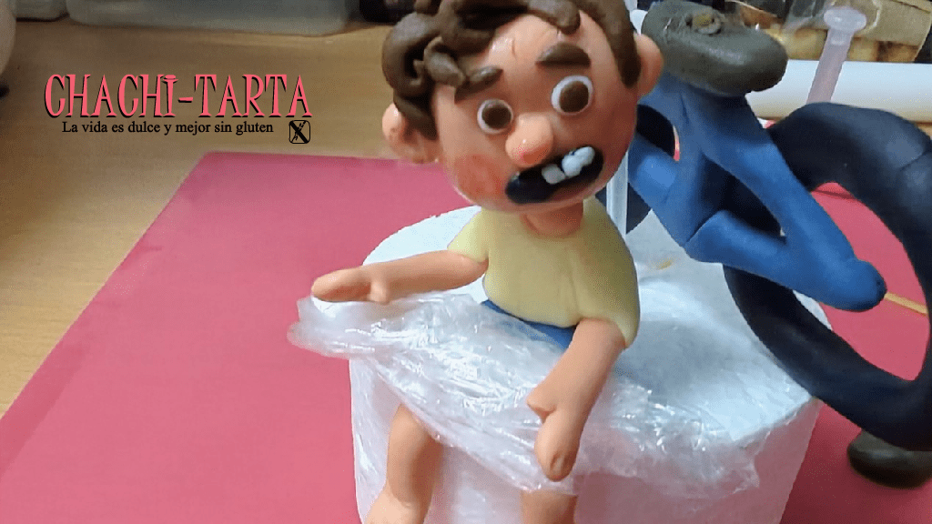 Al igual que con la figura de Luca, he utilizado espaguetis para sujetar la cabeza al cuerpo, inicialmente había pensado en ponerlos en las piernas también, esto para incrustar mejor en el bizcocho; pero luego los sustituí por palillos de madera, por 2 razones: 1- los espaguetis en contacto con la humedad del bizcocho y relleno se iban a ablandar y 2- al sacar la figura del bizcocho los palillos de madera se ven y no hay peligro.
