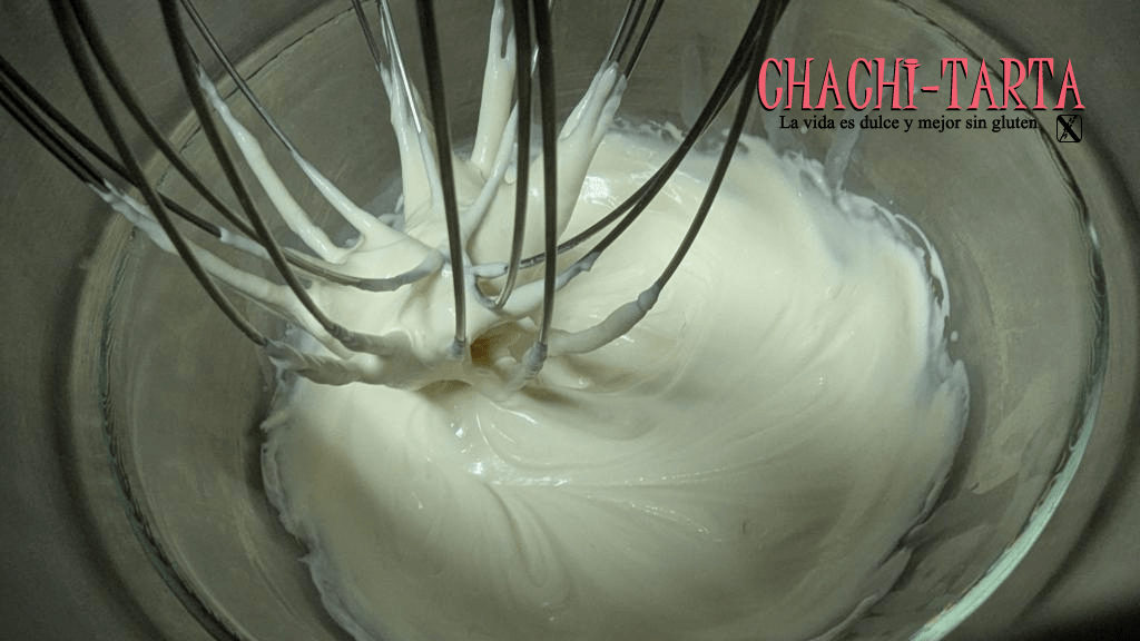 Cuando esté todo integrado, conserva en la nevera durante al menos unas 4 horas (o si puedes más), tiene que estar bien fría para que monte bien. Si ves que no lo consigues puedes añadir una cucharadita de cremor tártaro, esto también ayuda a dar consistencia. Una vez montada conserva en la nevera hasta que la vayas a usar.