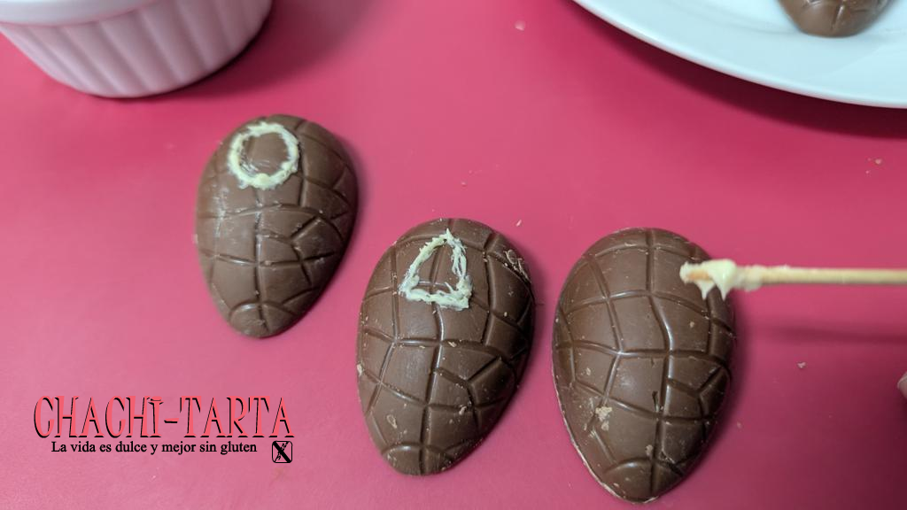 Mientras se va enfriando, preparamos el resto de la decoración. Para las máscaras he utilizado huevos de pascua de chocolate con leche, asegúrate que la marca de los que compres venga etiquetados sin gluten.