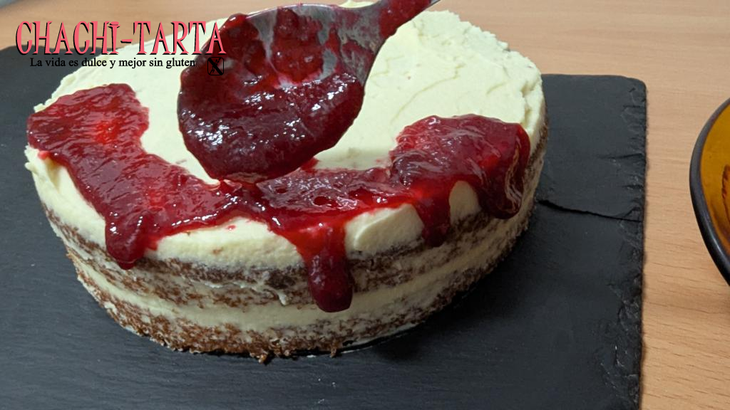 Cuando la confitura ya no esté caliente, vamos a ir recubriendo la superficie de la tarta, haciendo caída por los laterales como si se tratase de sangre, recordemos que esta serie es muy sangrienta 🤨😥