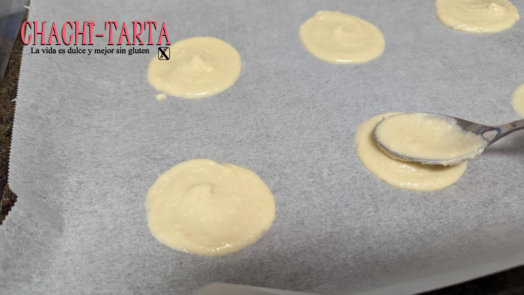 Prepara una bandeja de horno con papel vegetal, y coloca una cucharada de la mezcla dejando un buen margen de separación, extiende con ayuda de la cuchara, de manera que queden lo mas extendidas posible. Aunque las típicas tejas suelen tener forma alargada, yo las hice redondas pensando en utilizarlas como decoración.
